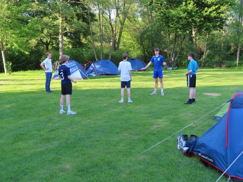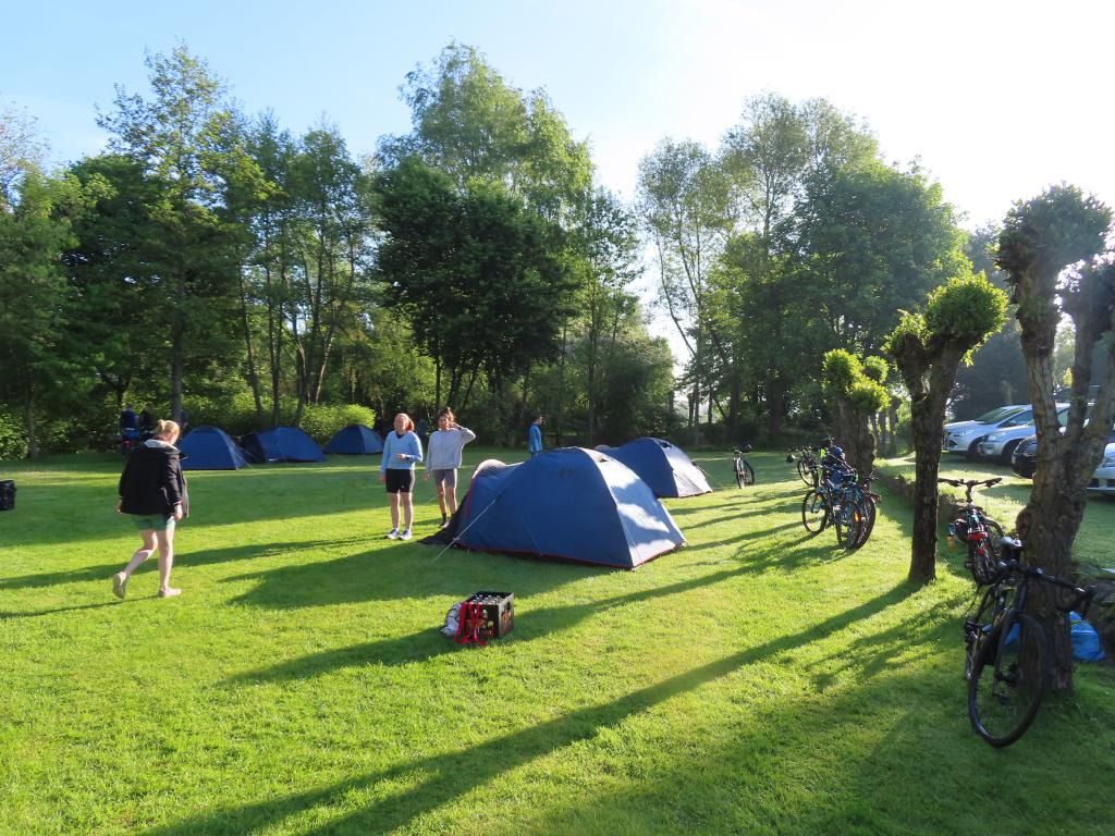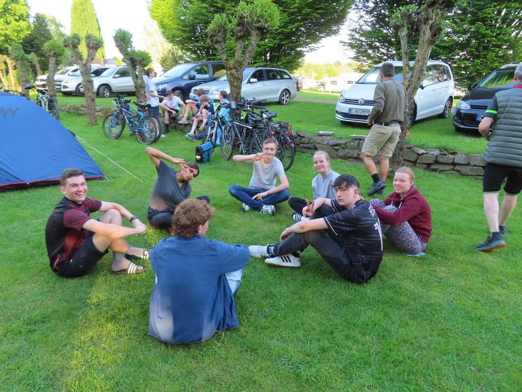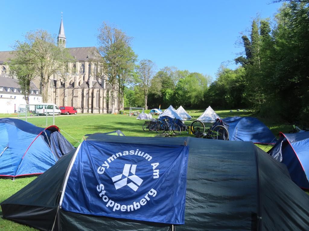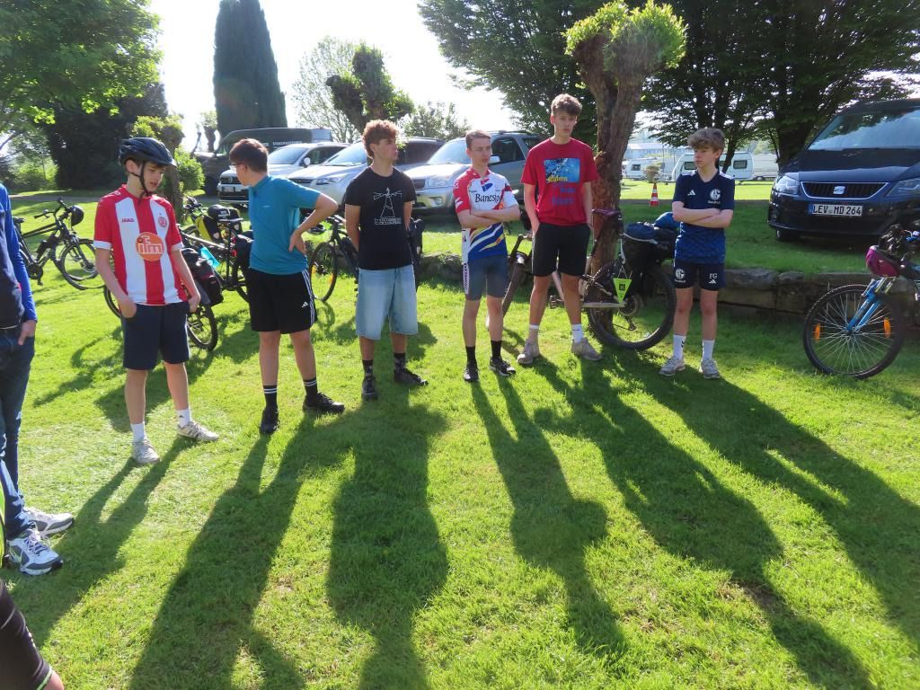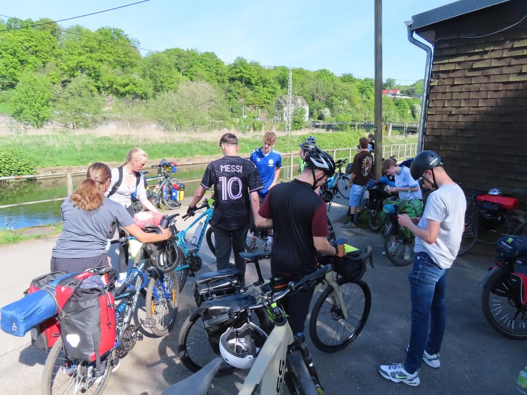 Die vollgepackten Fahrräder (KEINE E-Bikes!!! J) standen nach der Mittagspause vor der Schultür bereit. Neben dem persönlichen Gepäck, dass jede und jeder eigenständig transportieren musste, wurden auch noch die schuleigenen Zelte auf den Gepäckträgern verzurrt und so ging es gegen 14.45 Uhr los. Zunächst in Richtung Hattingen. Bei allerbestem Wetter war die erste, kurze Etappe perfekt zum „Einfahren“ geeignet. Auf dem Campingplatz Ruhrbrücke wurden wir sehr freundlich empfangen. Eine Wiese für unsere Zelte war bereits reserviert und so konnten wir nach dem Aufbau einen sehr entspannten Abend an den Ufern der Ruhr verleben. Vielen Dank an dieser Stelle an Frau Forch, die uns Grills, Grillgut und Getränke für diesen ersten Abend zum Campingplatz brachte!!! Wir waren bestens versorgt!