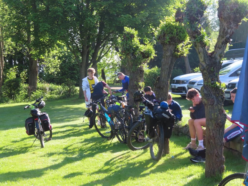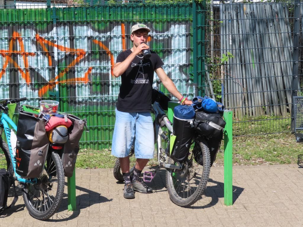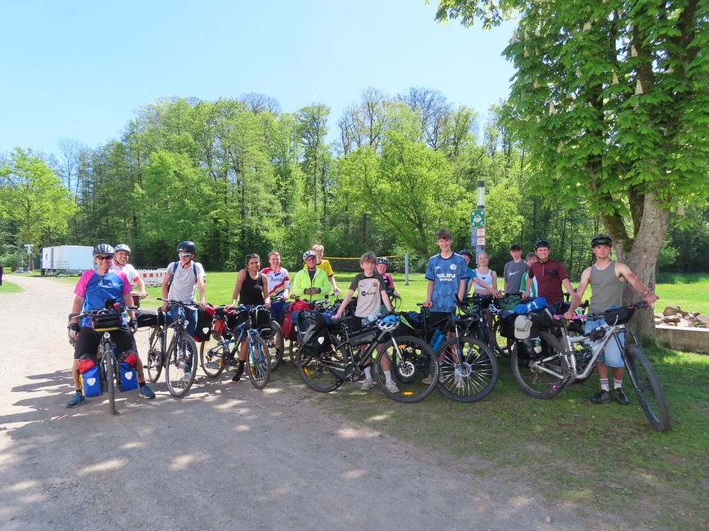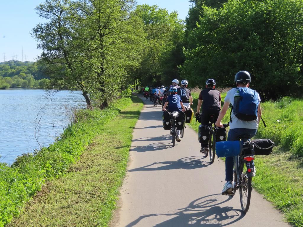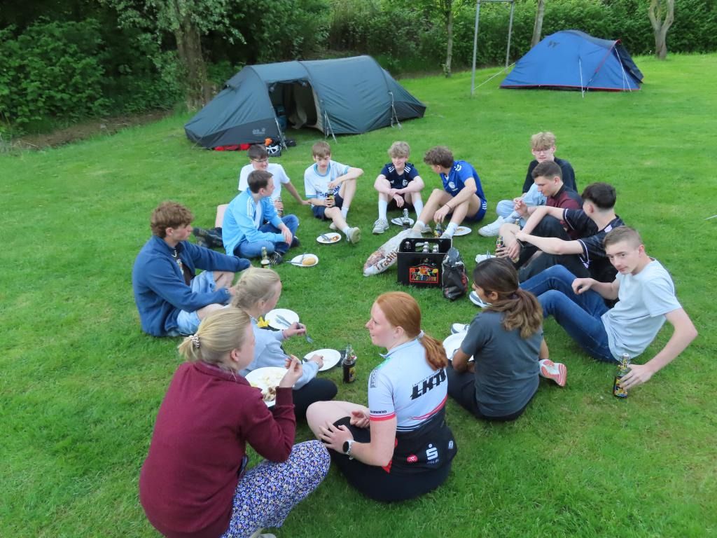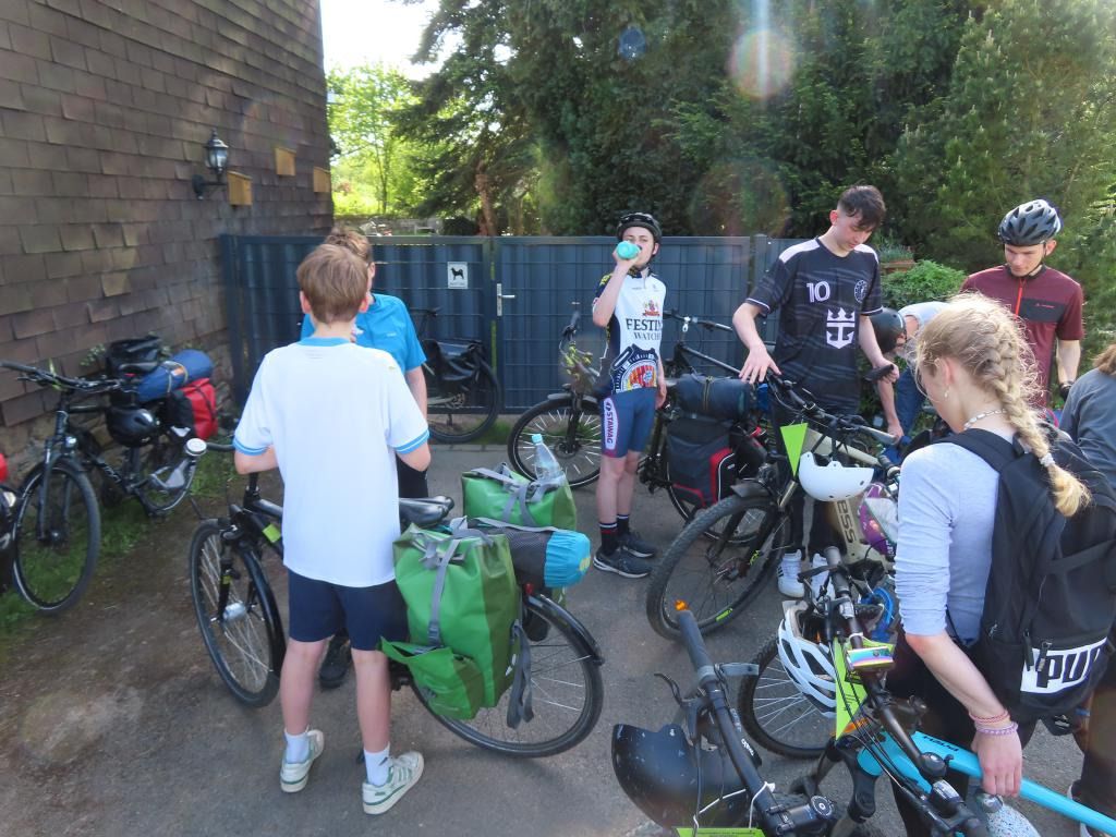 Die vollgepackten Fahrräder (KEINE E-Bikes!!! J) standen nach der Mittagspause vor der Schultür bereit. Neben dem persönlichen Gepäck, dass jede und jeder eigenständig transportieren musste, wurden auch noch die schuleigenen Zelte auf den Gepäckträgern verzurrt und so ging es gegen 14.45 Uhr los. Zunächst in Richtung Hattingen. Bei allerbestem Wetter war die erste, kurze Etappe perfekt zum „Einfahren“ geeignet. Auf dem Campingplatz Ruhrbrücke wurden wir sehr freundlich empfangen. Eine Wiese für unsere Zelte war bereits reserviert und so konnten wir nach dem Aufbau einen sehr entspannten Abend an den Ufern der Ruhr verleben. Vielen Dank an dieser Stelle an Frau Forch, die uns Grills, Grillgut und Getränke für diesen ersten Abend zum Campingplatz brachte!!! Wir waren bestens versorgt!