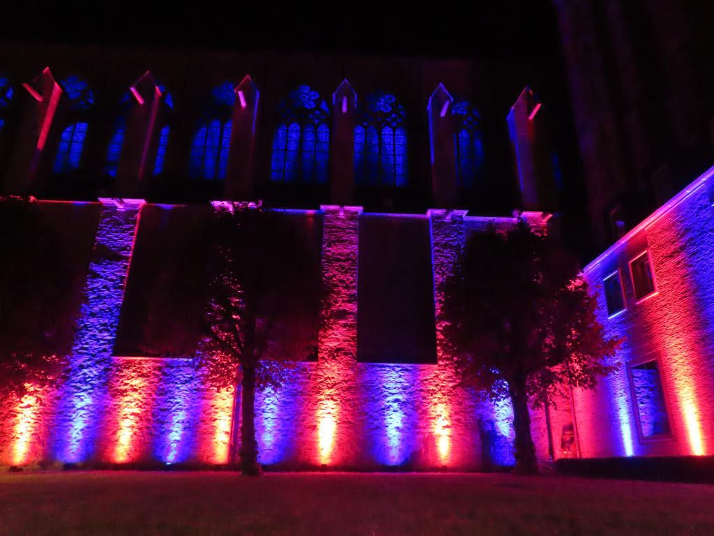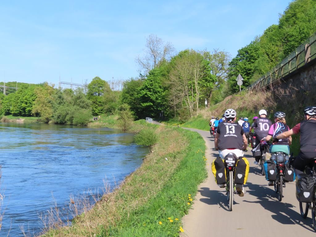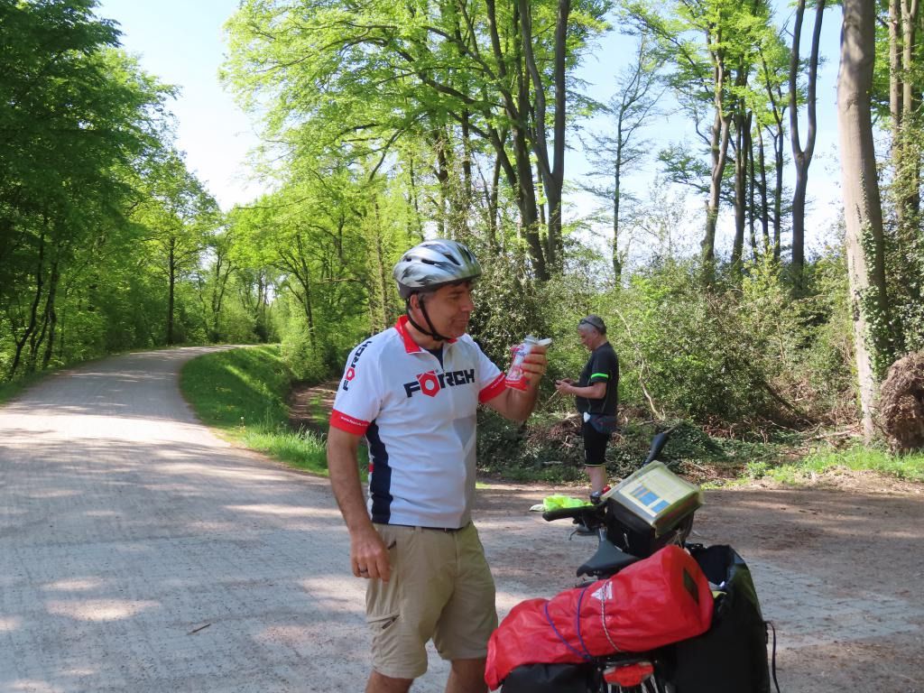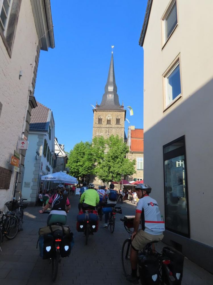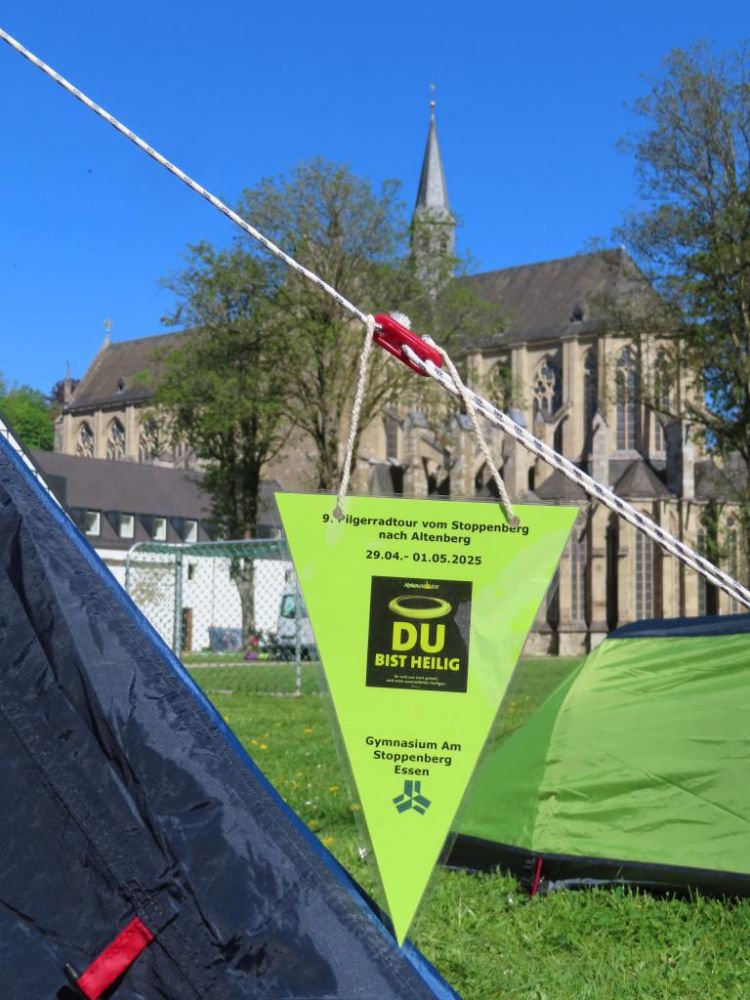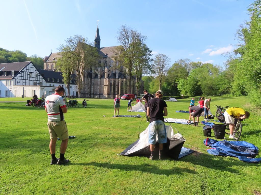 Deutlich steiler wurde es nämlich auf dem Wegstück von Wuppertal nach Remscheid-Lennep. Da die Strecke uns aber bei wiederum bestem Wetter über Nebenstraßen, Feldwege und vor allem durch eine wunderschöne Natur führte, meisterten am Ende alle den Weg problemlos. Ab Lennep ging`s über eine ehemalige Bahntrasse wieder sehr entspannt weiter. Lediglich die letzten Kilometer, kurz vor dem Ziel, führten uns am Rande der B51 entlang. Nicht sooooo hübsch aber leider unvermeidlich. Belohnt wurden wir für unseren Einsatz, indem wir gegen 17.30 Uhr als eine der ersten Gruppen am Altenberger Dom eintrafen und freie Auswahl für den Aufbauplatz unseres Camps hatten. Vorausschauend hatten wir schon auf dem Weg für 18.30 Uhr Pizzableche zum Dom bestellt. Einer Stärkung nach getaner Arbeit stand also auch nichts mehr im Wege.