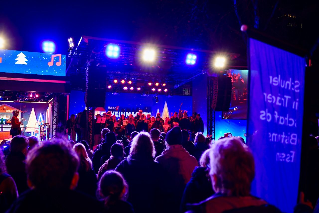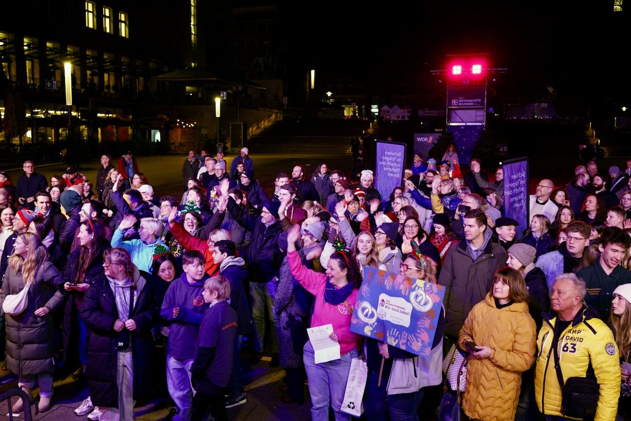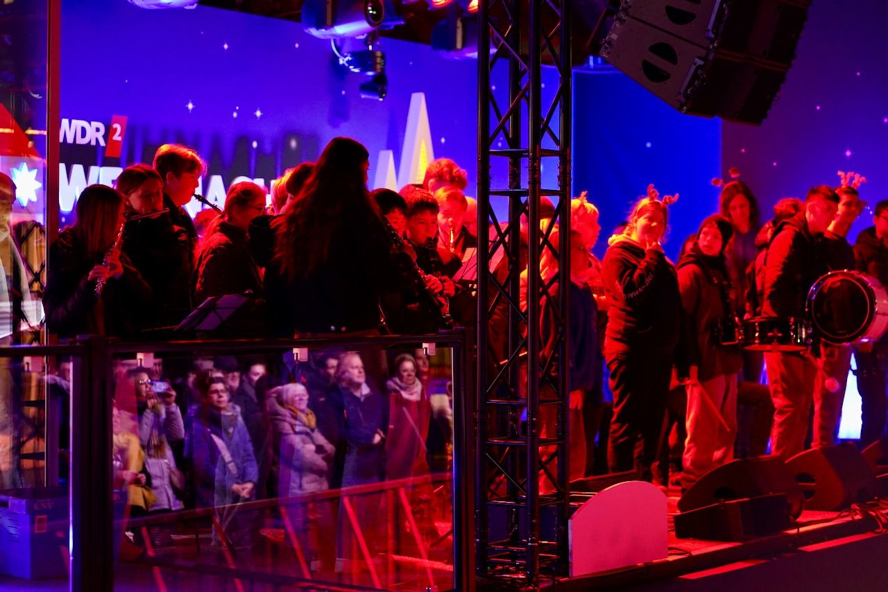 Am Dienstagmorgen, 16.12.2025, machte sich unsere Schulgemeinschaft in aller Frühe auf den Weg zum Burgplatz. Um 06.10 Uhr waren die Schulen in Trägerschaft des Bistums Essen im Rahmen des WDR 2-Weihnachtswunders live auf Sendung.