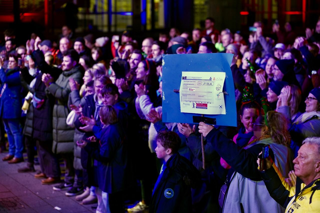 Gemeinsam mit den anderen sechs Schulen aus Gladbeck, Essen und Duisburg überreichten wir einen symbolischen Scheck über 27.721,41 Euro, der das Ergebnis vieler Spendenaktionen an allen beteiligten Schulen sichtbar machte. Das gesammelte Geld kommt Menschen zugute, die auf Unterstützung angewiesen sind.