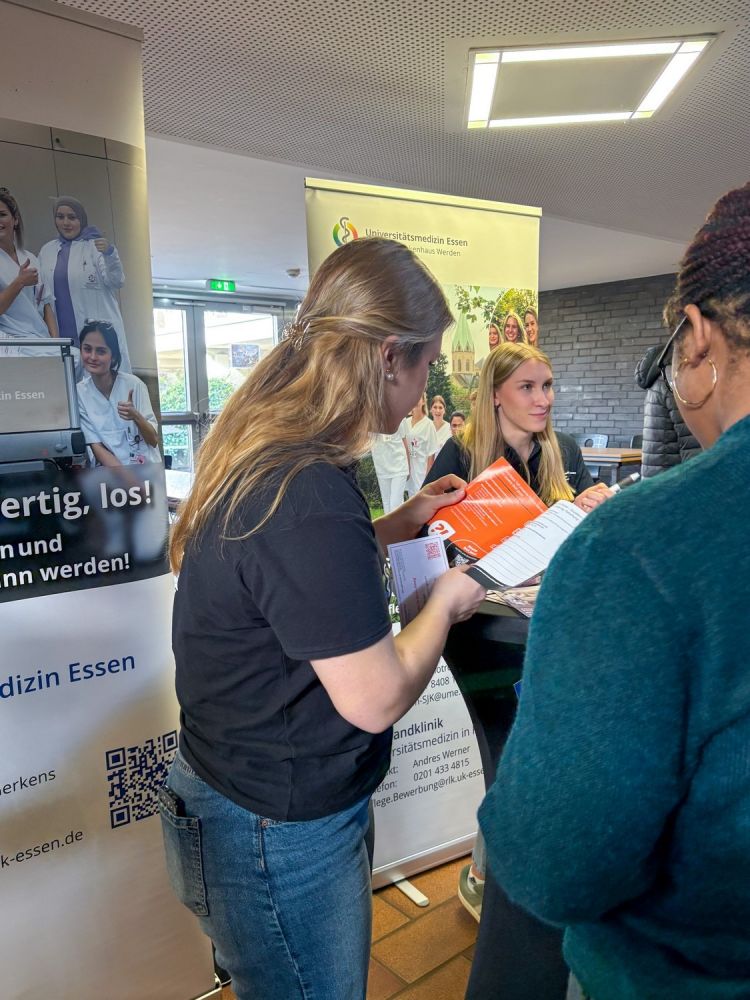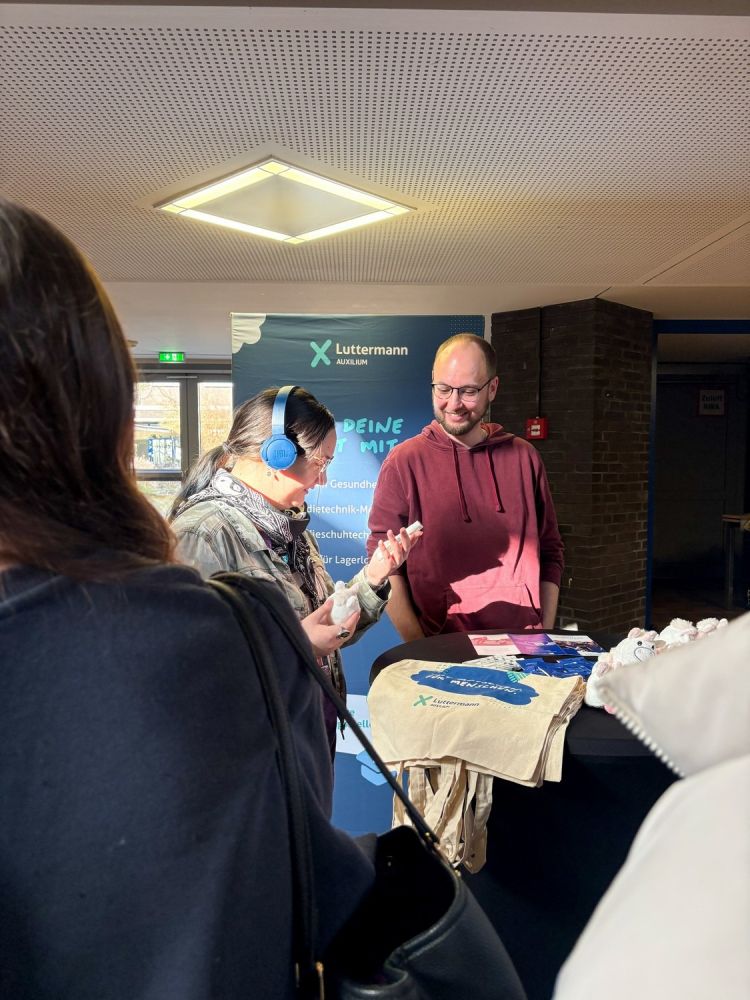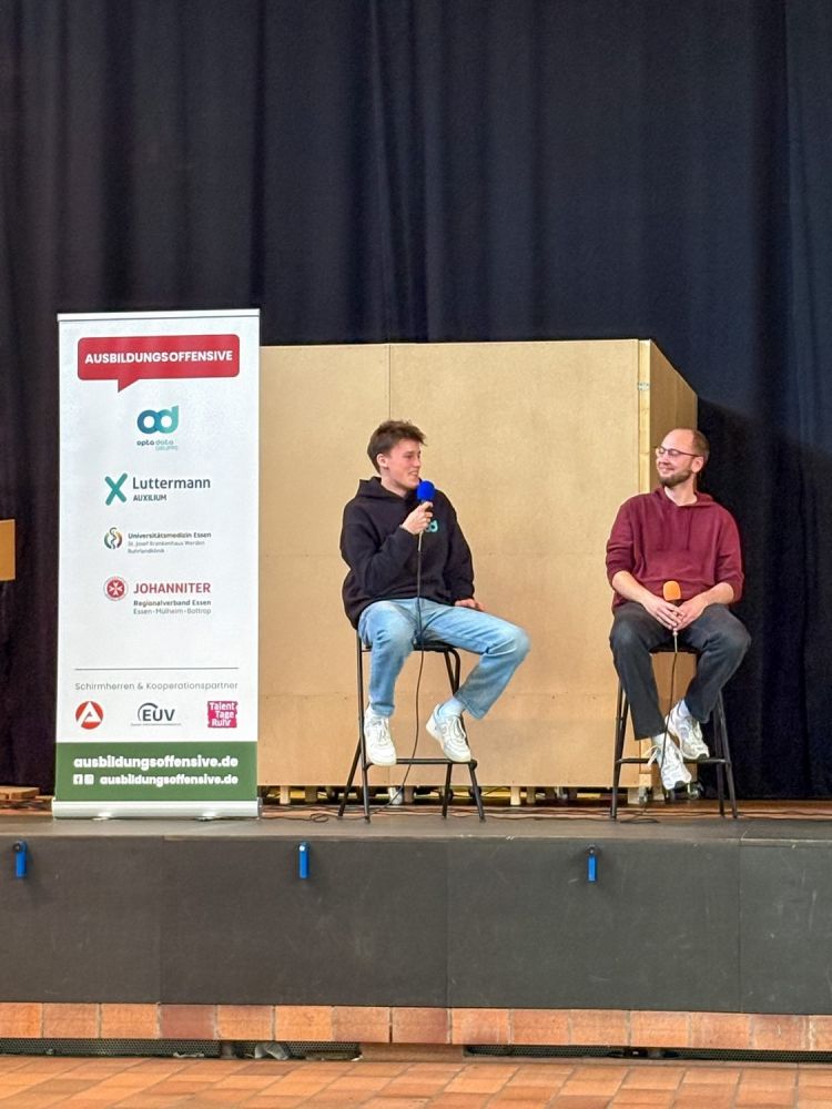 Auf der Bühne vertreten waren optadata, die Johanniter, die Ruhrlandklinik sowie Luttermann. Gemeinsam zeigten sie die Vielfalt moderner Gesundheitsberufe – von kaufmännischen und digitalen Tätigkeiten im Gesundheitsmanagement über Rettungsdienst und Pflege bis hin zu spezialisierten klinischen Einsatzfeldern und Rehatechnik. Azubis und Dualstudierende berichteten aus ihrem Berufsalltag, schilderten ihre Bewerbungsprozesse und erklärten, welche persönlichen Stärken im jeweiligen Arbeitsfeld gefragt sind. Dabei wurde deutlich, wie facettenreich die Wege ins Gesundheitswesen sind – sowohl über klassische Ausbildungsberufe als auch über weiterführende Qualifizierungen.